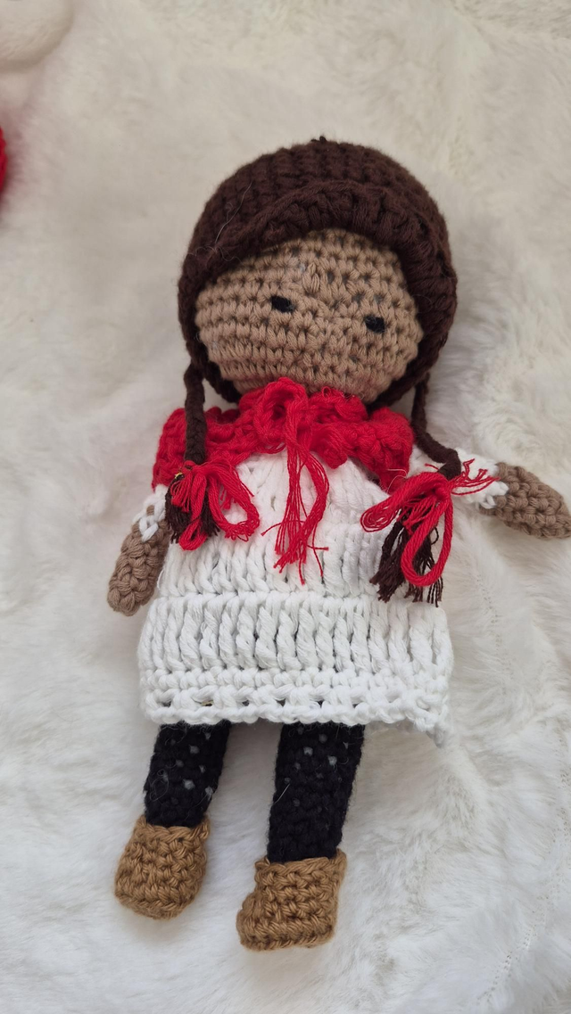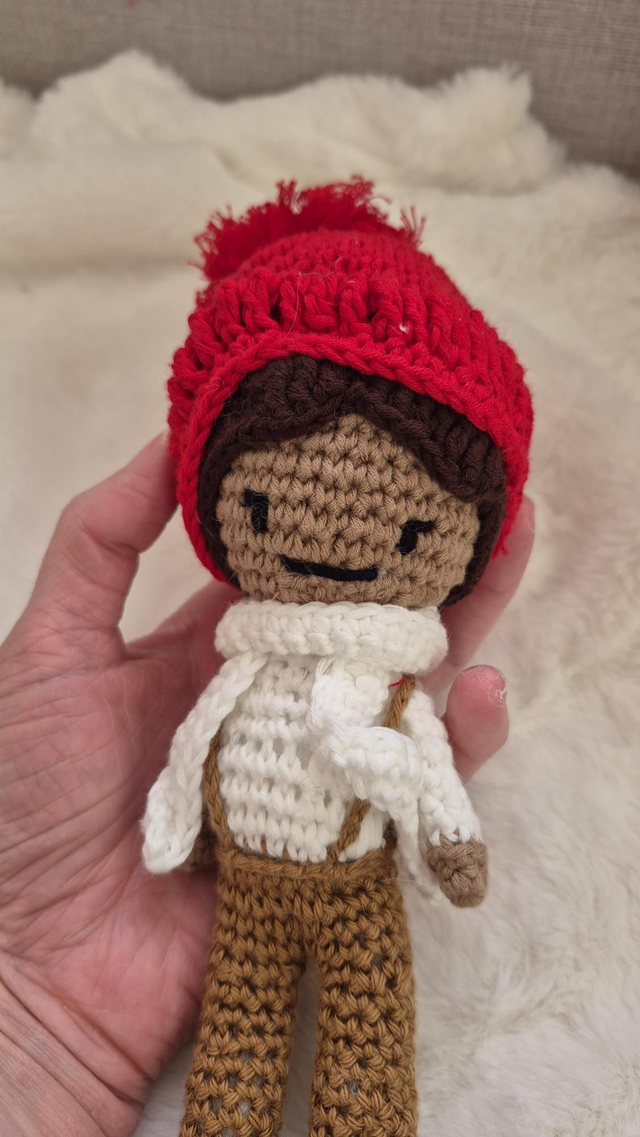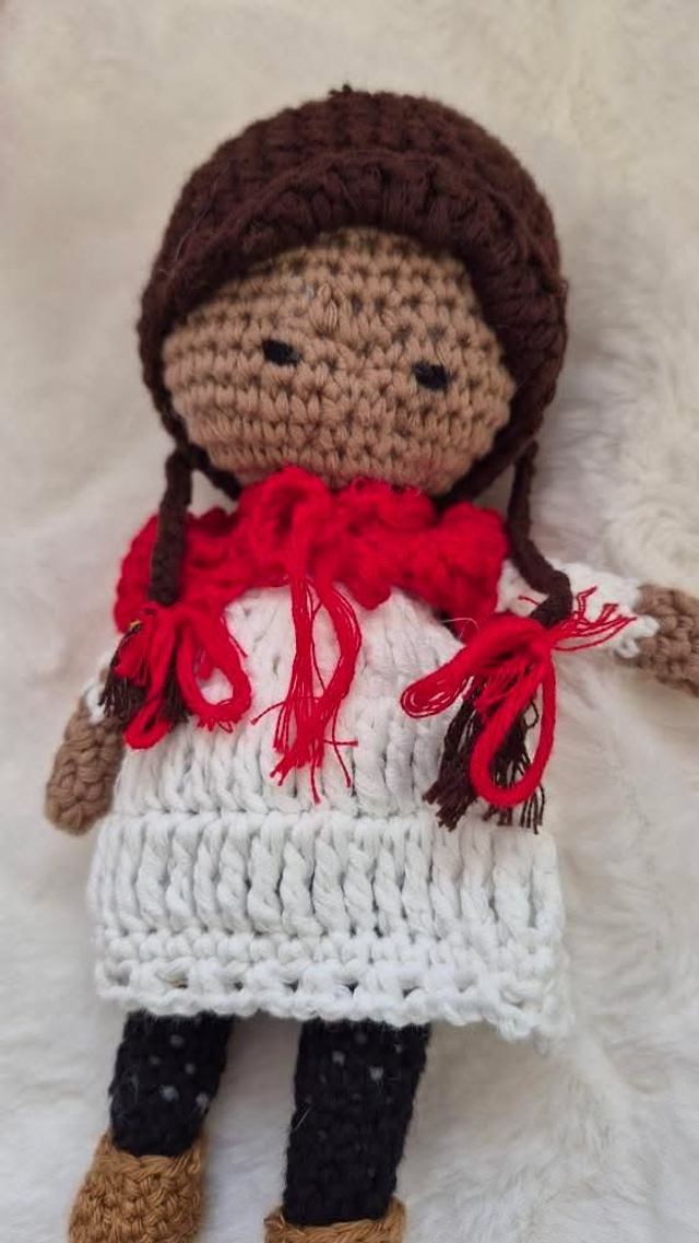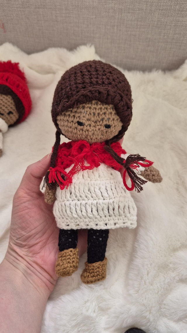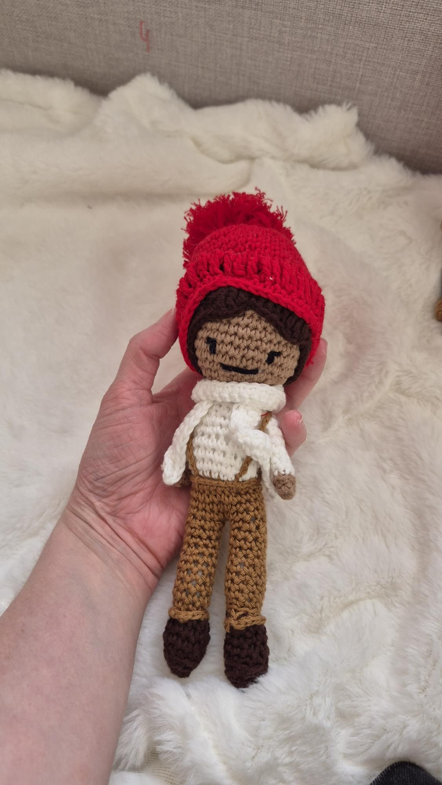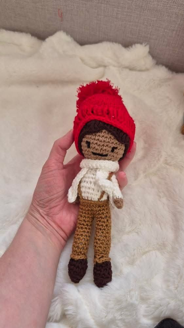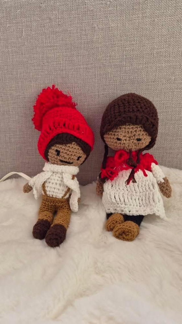 Ces deux poupées artisanales au crochet forment un duo unique avec leurs tenues bleu ciel et leurs bonnets orange fleuris.