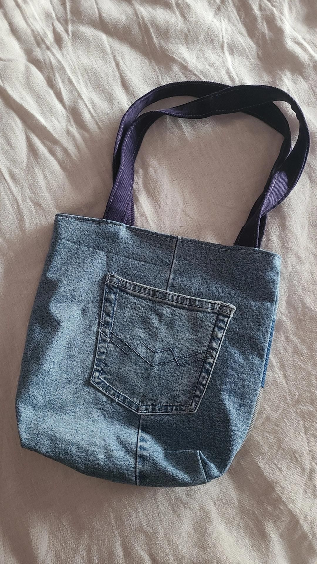 Ce petit tote bag a été confectionné à la main à partir de plusieurs morceaux de jeans recyclés, créant un patchwork unique pour chaque pièce.